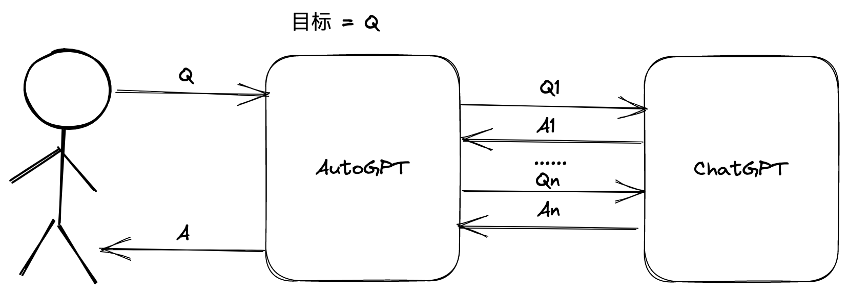 ChatGPT以交互式的方式回答使用者提出的问题,从而实现一个完整目标。而AutoGPT通过对目标进行分解,并不断进行反馈迭代,从而自主地解决整个目标。