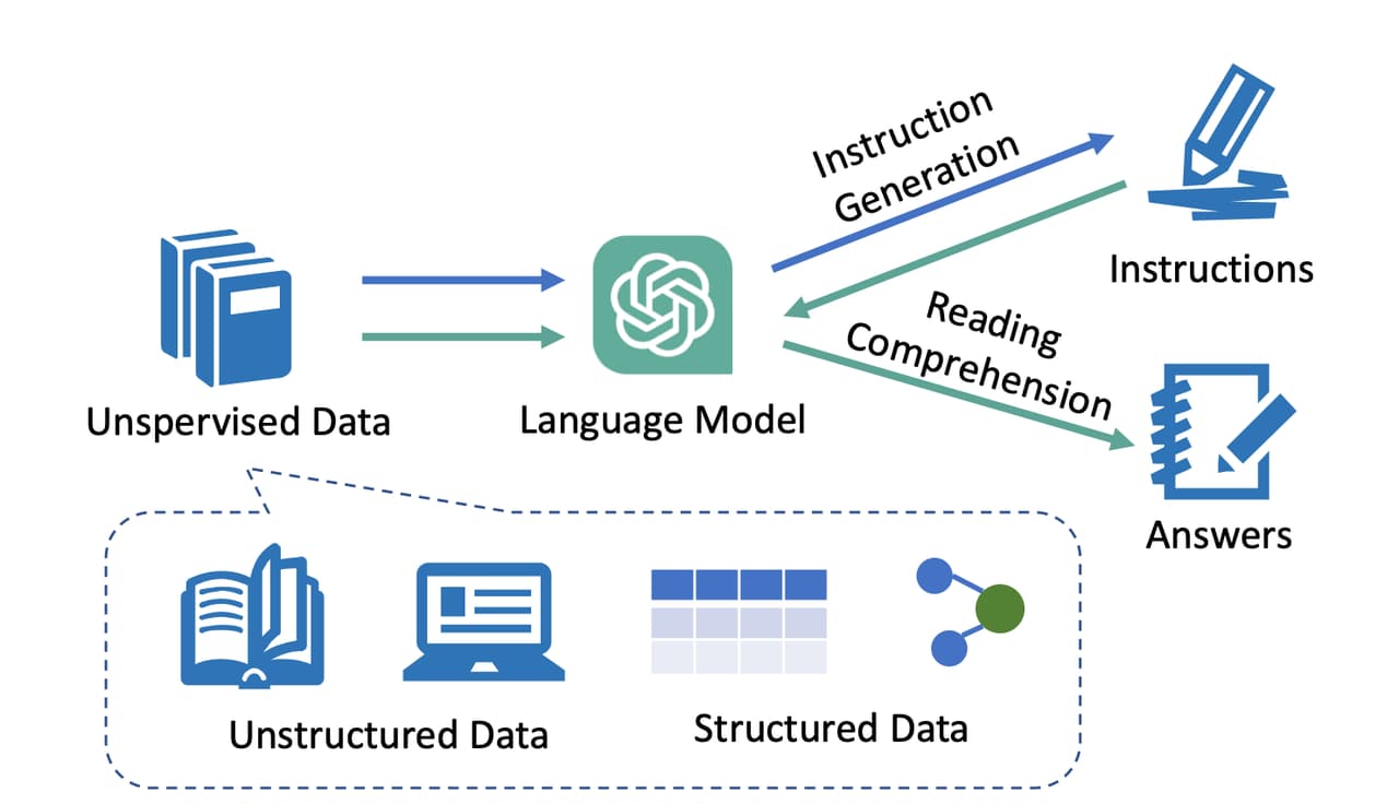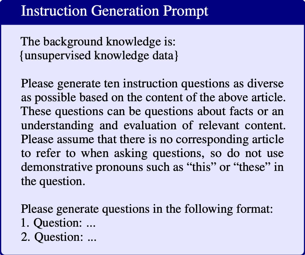 Self-QA 使用无监督的方式代替手工编写的种子指令,将非结构化的数据喂给 LLM,并让其根据此数据上下文生成指令数据。