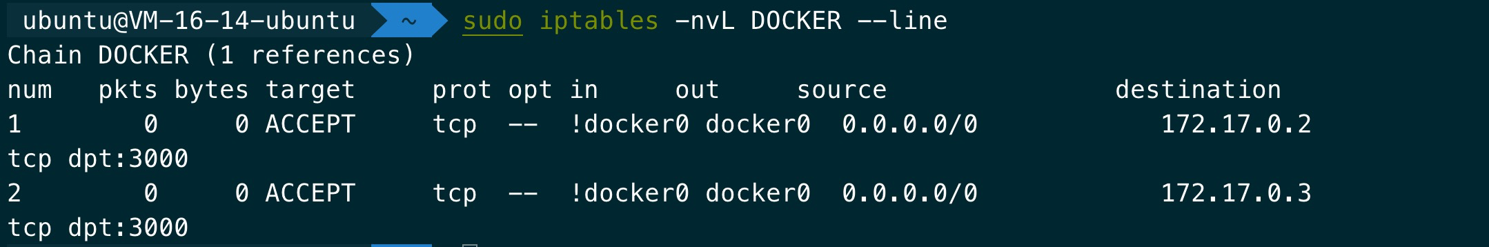- Rule2表示接受不是从docker0流入,但从docker0流出,并且访问的目的IP为172.17.0.3, 访问目的port为3000的tcp报文。