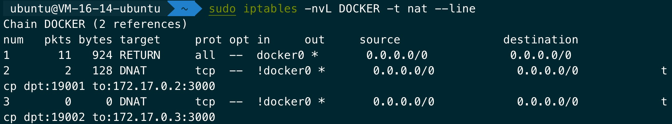 - Rule2, Rule3分别表示两个容器publish了3000端口到19001端口,3000端口到19002端口。那些不是从docker0流入的数据包想要访问容器内的服务时,访问对应网卡上的19001端口的tcp请求就转发到172.17.0.2:3000;而访问19002端口的tcp请求就转发到172.17.0.3:3000。