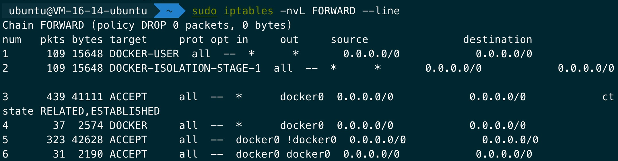 DOCKER-USER,此链只有一个RETURN动作,如果需要在此docker环境下手动添加iptables rules可以选择在此处添加。Rule2引用了