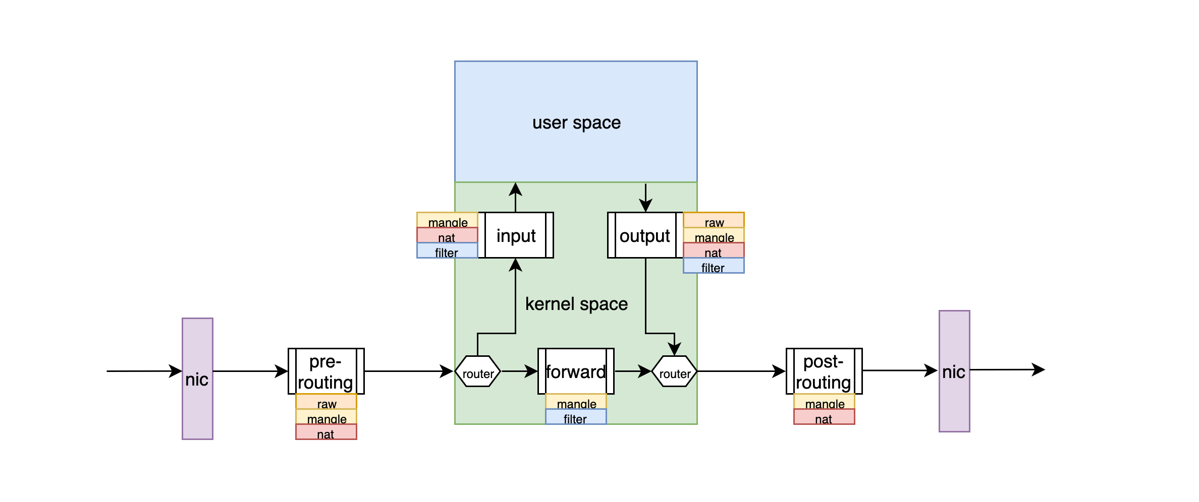 注意黑白名单机制并非只能靠调整默认策略实现,设置默认策略只是实现此机制的一种方案,也可以通过其他方案来实现黑白名单机制,比如将默认策略设置ACCEPT,在链的尾部加一个DROP ALL的规则可以实现白名单机制。通常不建议将默认策略更改为DROP/REJECT,因为在此默认策略下,误flush了链会导致所有请求被拒绝。同一链上各表执行优先级: