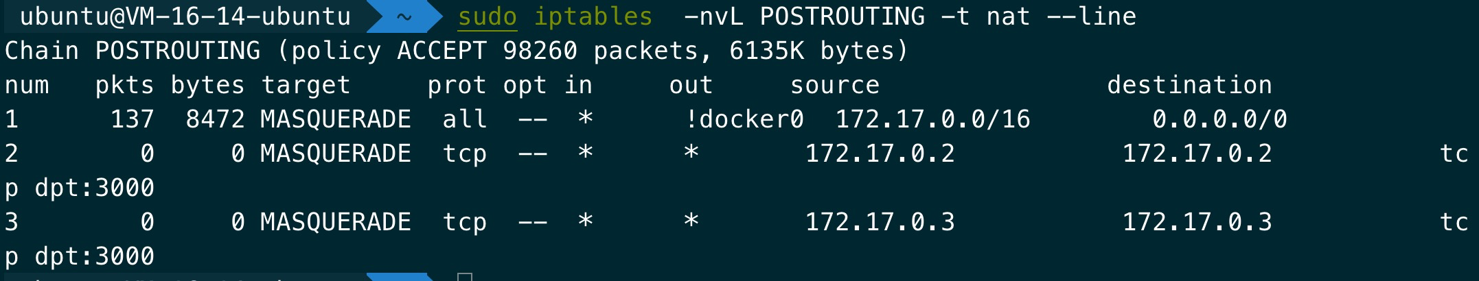 172.17.0.0/16的数据包会被进行动态SNAT,将数据包的源IP改为流出网卡的地址,若从容器内访问外网,源IP会被更新为宿主机物理网卡的IP地址。 - Rule2,Rule3乍一看像是自己访问自己的3000端口时会采用MASQ。但从容器内路由规则可以看到,容器内访问容器网络是无需路由到docker0,而直接在二层网络上转发。而容器内通过容器IP访问自身服务是无需经由docker0的,因此第2、3条的作用不明确。