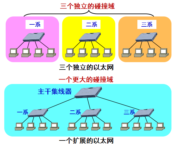 物理层通过使用光纤和光纤调制解调器进行电/光信号转换,可以将多个集线器连接起来,避免减少信号的衰减导致的CSMA/CA协议无法工作,本质上扩大了碰撞域。