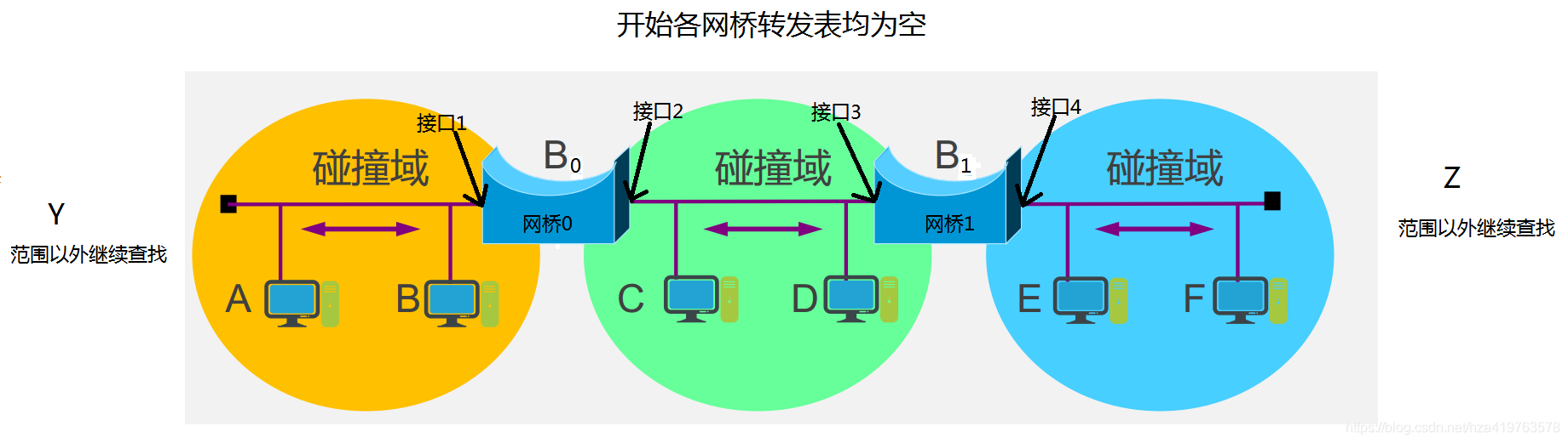 扩大碰撞域 网桥:将多个网段连接起来,扩展以太网范围,其依赖转发表来在各个网段中转发帧。
