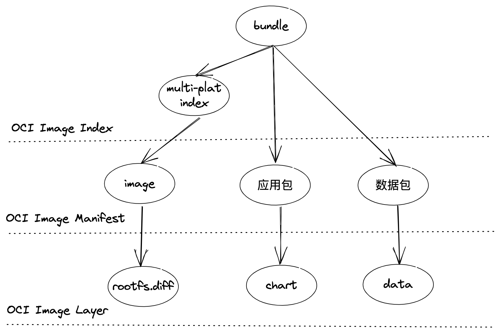 当前打包策略实现了OCI Artifacts的高扩展性,结构树可以灵活地向上延展,比如bundle里嵌套bundle。