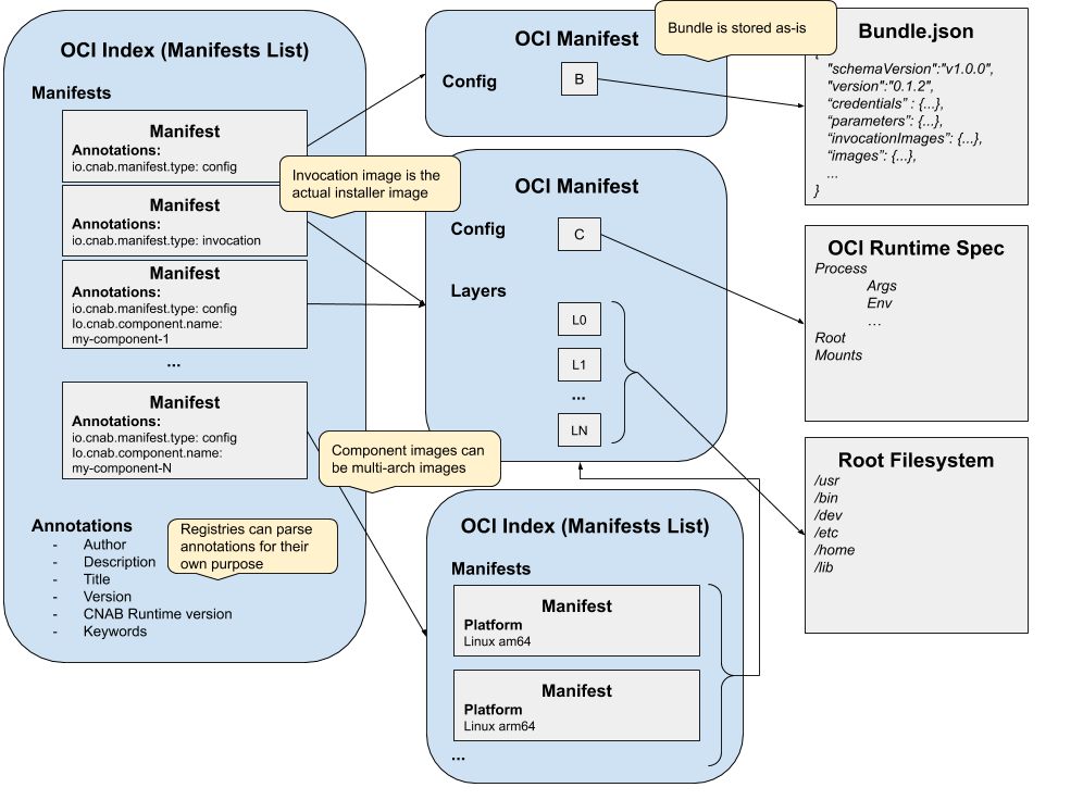cnab给我们提供一个很好的组织方式的参考,bundle reference作为检索的入口,可以关联到所有的artifacts,形式上就类似于一个image index与image manifest之间的关系。
