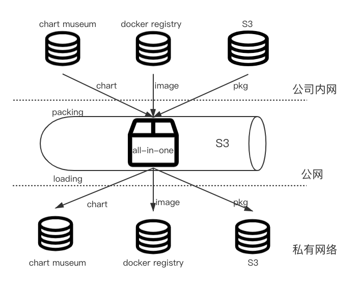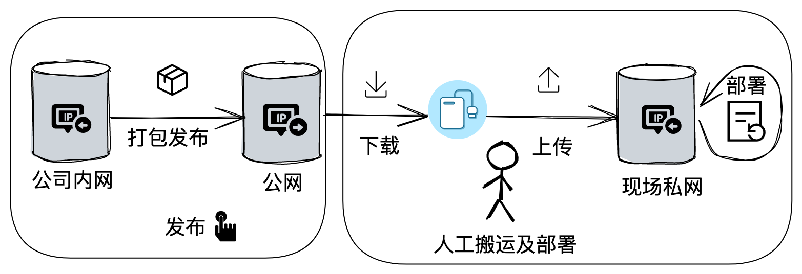 显然,在网络受限的环境下,应用相关的所有资源都只能通过人肉搬运。下面的模式是私有化交付场景下常见的模式。