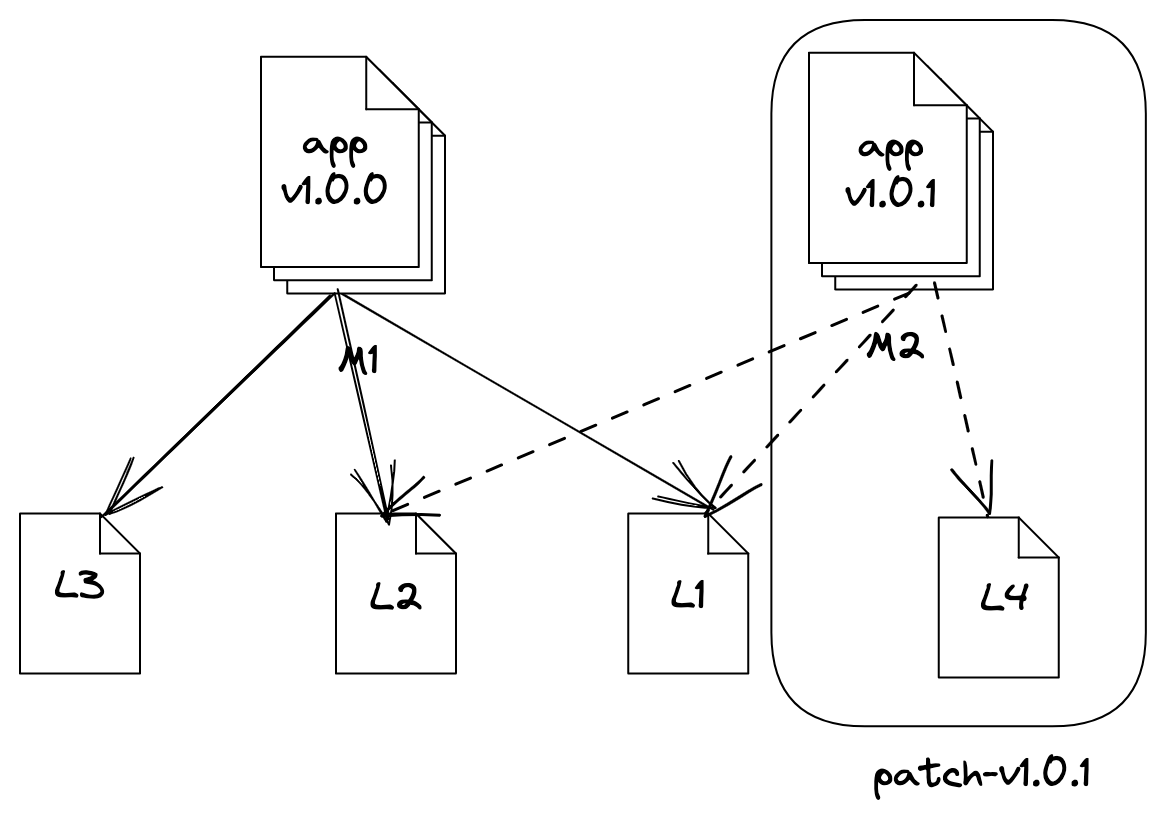 初次交付时,这一问题无法避免,因为这时现场是个空的registry,需要mirror应用所需的所有artifacts。但是如果现场因新需求或bugfix等原因需要升级时,就不需要mirror另一个版本的全部content了。我们可以对这两个版本的bundle进行diff,生成一个补丁包来承载新版本存在,但老版本不存在的blob集合。如下图所示,app从v1.0.0升级到v1.0.1仅需要将M2与L4打到补丁包里即可,即其复用了就版本的L1与L2两个blob。