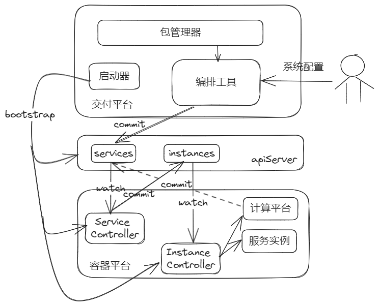 - 交付平台启动器将其所依赖的服务(API-Server, Service-Controller, Instance-Controller)部署到容器平台上。