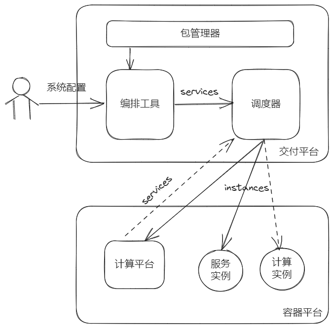 - 交付平台部署的服务中,存在平台级应用(如计算平台),用户基于计算平台可以更改计算实例,即某些服务可以直接对接底座容器平台。