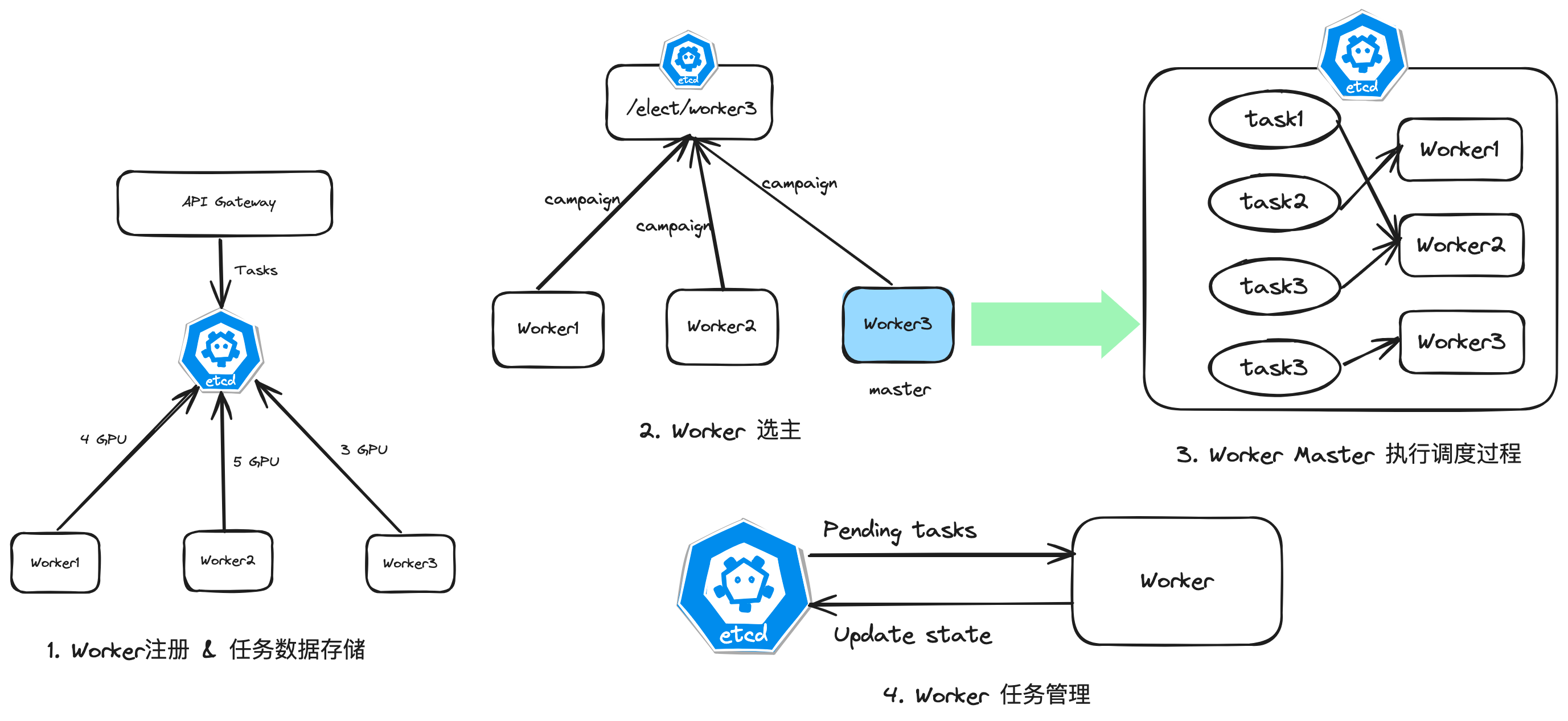 - Worker 向 etcd 注册 GPU 资源及可处理任务的类型。
