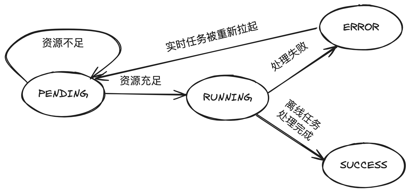 - 实时任务支持暂停解析的功能,离线任务不支持暂停的功能,离线任务执行状态中 SUCCESS 与 ERROR 状态为终态,不会被重试拉起。