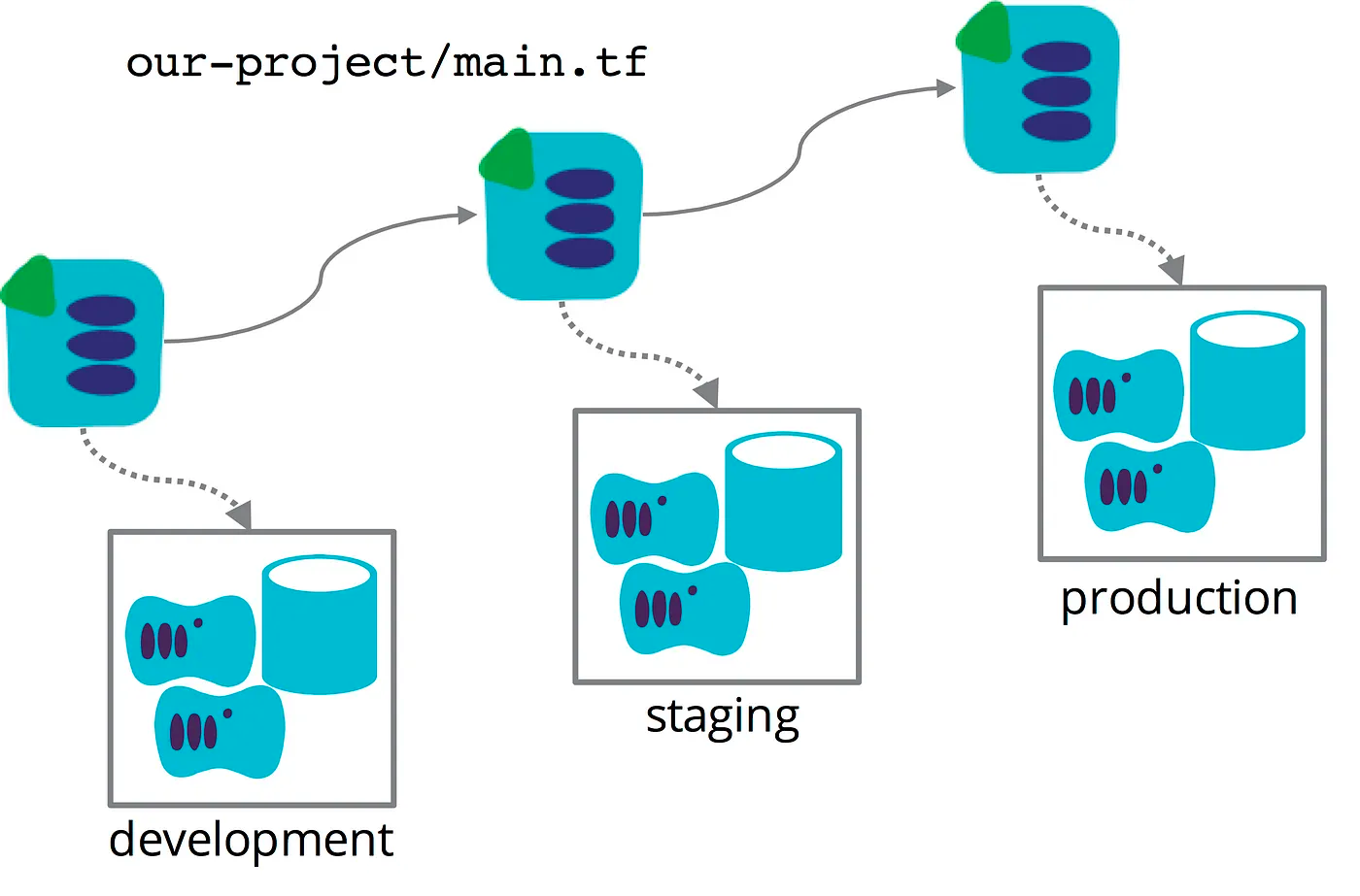 一般的产品迭代过程分为需求研发、质量测试、功能上线等阶段。在不同的阶段,我们通常需要维护一套独立的环境以达到当前阶段的目的,比如通常我们需要维护dev、stage、prod三个环境。Terraform可以帮助我们简化多环境管理,越来越多的多环境管理的最佳实践被提了出来。
