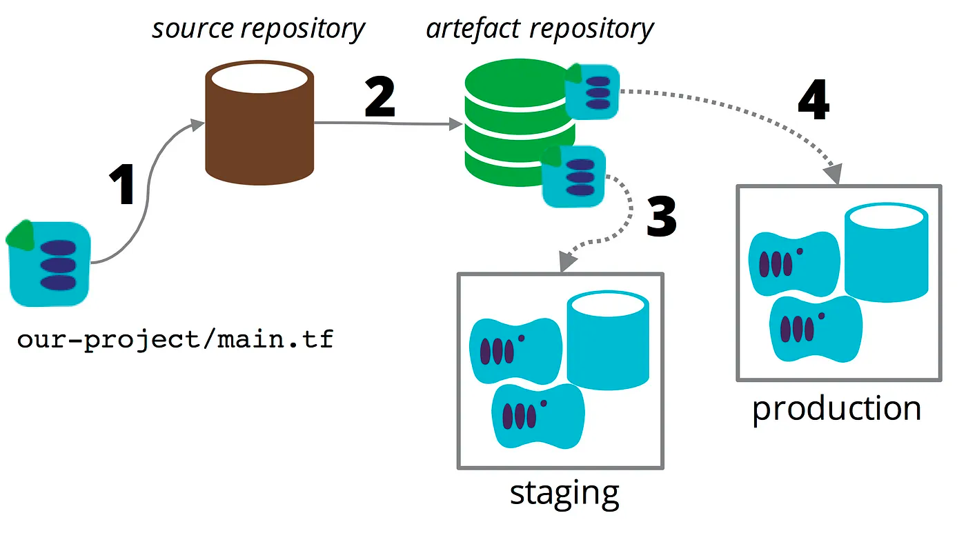 比如下面的案例中,一套代码控制多个环境使用,但通过一条pipeline将环境连接起来,从而实现自动化部署、测试、上线的能力。这依赖了Terraform基础设施构建的一致性。